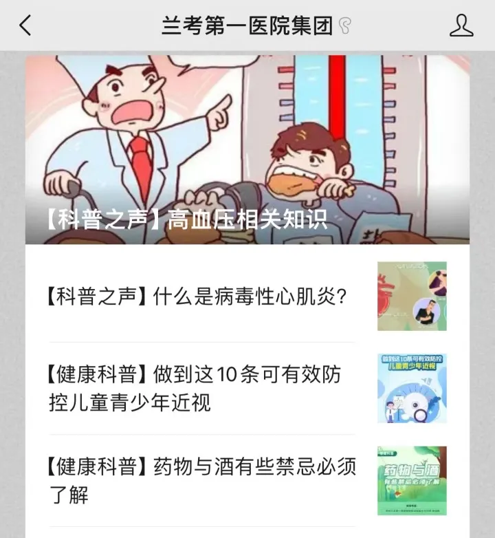 兰考第一医院集团在其微信公众平台上长期更新“健康科普”及“科普之声”两个频道。